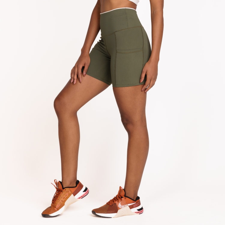 O detalhe do composê aparece no cós com uma sutil faixa do forro off-white à mostra, marcando a cintura e adicionando um toque de estilo ao seu look fitness.